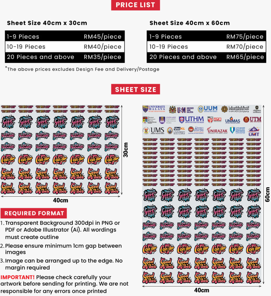 *Harga di atas tidak termasuk design fee dan shipping cost. Design fee bergantung kepada kerumitan design. Shipping cost RM10.00 Semenanjung Malaysia dan RM15.00 Sabah/Sarawak